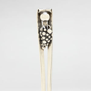 This large server is a lovely example of Danish-inspired design, it is interpreted with DeMatteo's distinctive traits. Two squared silver wires of heavy gauge are slightly angled. The top of the handle is joined to a cast and an applied hanging grape cluster. The base of the handle is attached to the shaped blade.