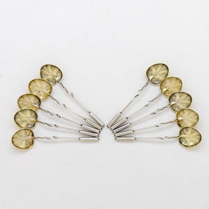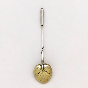 These small spoons are lovely. The slightly curved handles are formed as a stem topped with a cattail. A silver tendril wraps around the lower part of the handle, joined to the lily-pad bowl. The bowls are wonderfully detailed and enhanced with gilding on their fronts and backs.