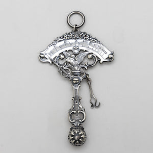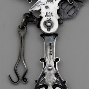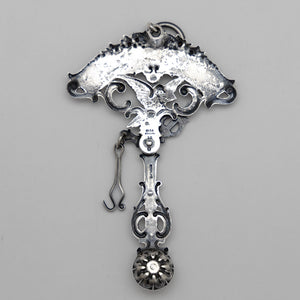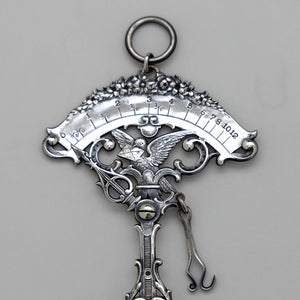 This wonderful and uncommon item was used to weigh letters. We've never had one of these before and it is lovely. The curved scale, adorned with flowers and leaves, measures from 0 to 12 ounces. Below the decorative scale is a winged bird grasping a letter in its beak. I find humor in hoping Gorham's designer meant this to be a carrier pigeon. The weighted pendulum is also ornate, along with the arrow hand, weighing clip, and hook.