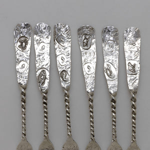 'Hamburg' is a very rare, interesting and fun design. In the 1885 Gorham Records at the John Hay Library at Brown University, this 2-tine fork style is identified as being for oysters (although they are regularly sold as fruit or berry forks). Above the twist handles are flattened areas of irregular shapes. The surfaces of both sides are textured, resembling excavated rock, with the fronts having impressions of various animals. Included are frogs, a butterfly, a lobster, a crab and various fish.