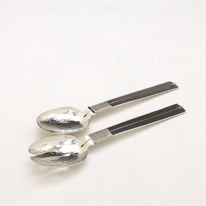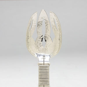 These servers are magnificent examples of Spratling's bold flatware designs. Rising from 13 bands around each base of the dramatic handles is a single, bold, incised line that splits at the top with a simple seed decoration. The pierced bowls of the fork and spoon shimmer with exceptional hammering.