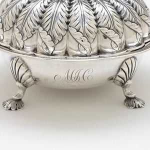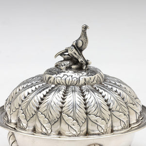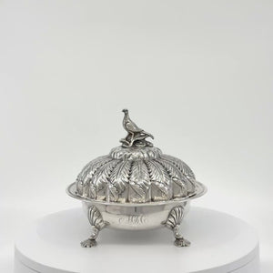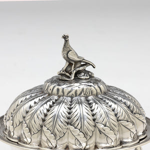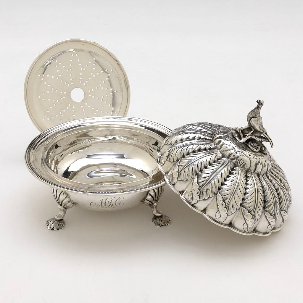 This is a stunning butter dish of wonderful quality and craftsmanship. The lower half is elevated on four legs terminating with foliate pad feet and connecting to the body with textured shell devices. The outer rim of the plain base, monogrammed 'MJC', has a simple bead ring for decoration. The interior of the rim has a raised ring that holds the floriform pierced strainer and supports the cover. Ornately executed cascading, exotic leaves with turned ends emanate from the top. This scene is of a pheasant standing on a branch amongst flowers, rocks and grass.